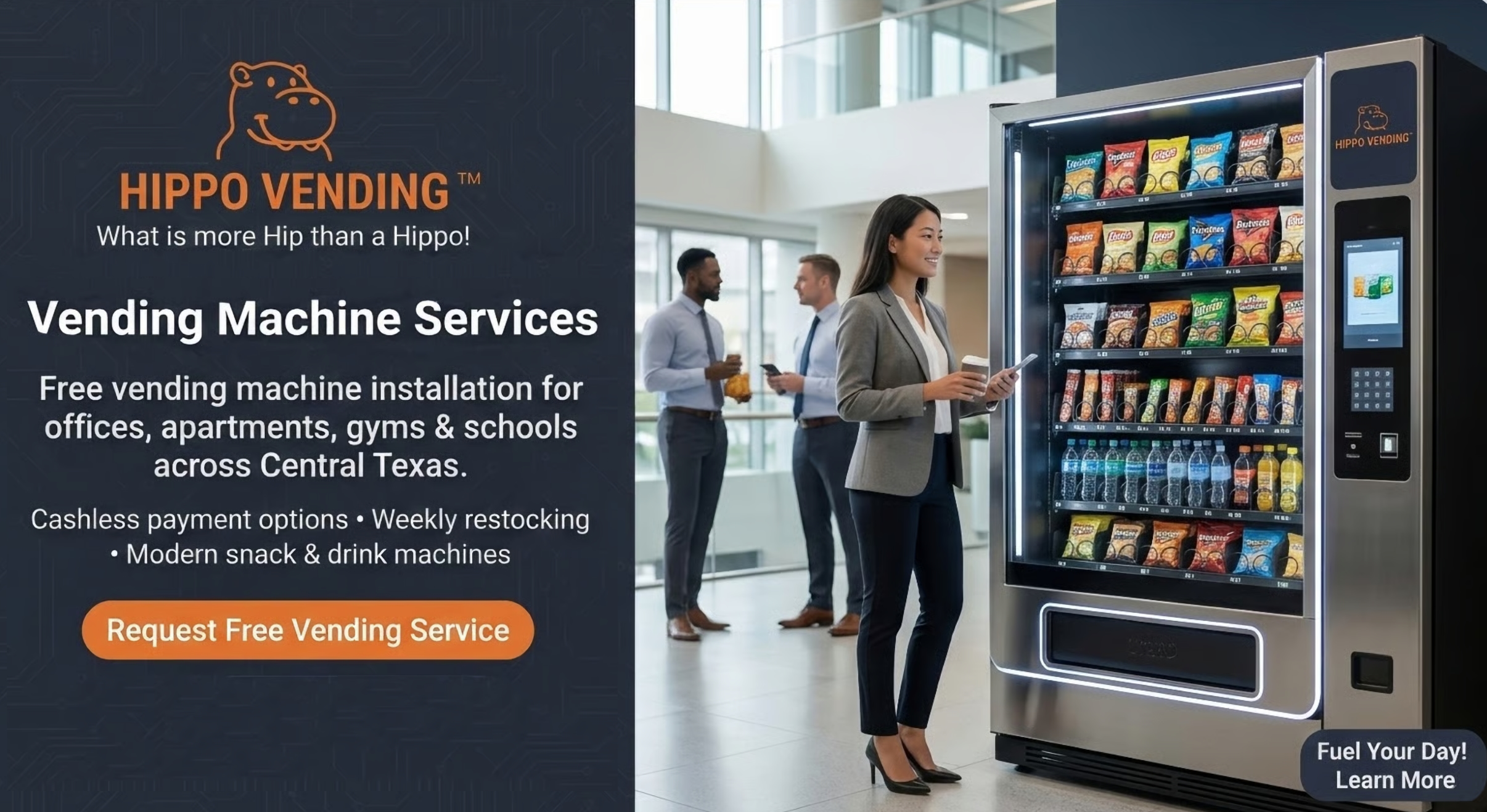 Hippo Vending™ provides complete in-house service for all vending machines and smart coolers. Our dedicated team is ready to quickly and efficiently handle everything from machine errors to new snack requests. We ensure your machines remain fully stocked and operational, delivering a consistently hassle-free experience.